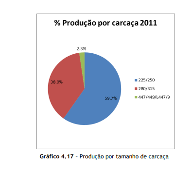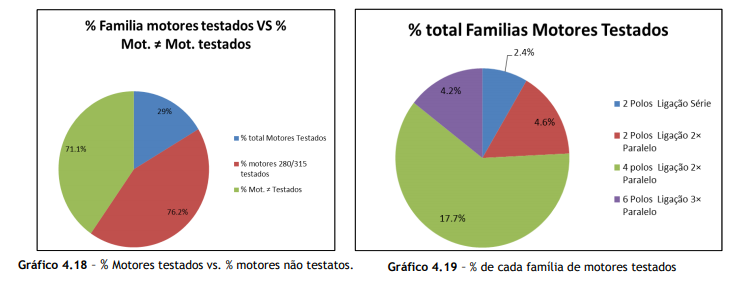 Pelo Gráfico 4.18, acima, é possivel observar-se que entre todos os motores produzidos na Fab III em 2011 apenas uma percentagem de 29 % é incluida no nosso estudo considerando-se todas as carcaças, considerando-se as carcaças 280/315 foram considerados um total de 76 % de motores com características iguais aos motores testados. O gráfico 4.19 representa de entre as carcaças 280/315 a percentagem de cada família de motores testados sendo a esmagadora maioria motores de 4 polos ligação 2 × paralelo.