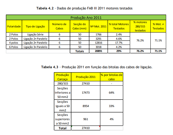 Os motores testados tinham secção dos cabos de ligação de 50 mm2 , no entanto foram consideradas todas as secções disponíveis porque como se pode ver pela tabela 4.3, no ano de 2011 foram produzidos mais motores com secções inferiores a 50 mm2 , o que na verdade significa que o refugo será maior do que o considerado porque motores com secções inferiores de cabos de ligação geram mais refugo (é necessário menos comprimento de pontas para se fazer as ligações).