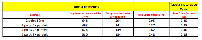 Para o estudo foram tiradas amostras de motores: 2 polos ligação série e ligação paralela, 4 polos ligação paralela e 6 polos ligação 3 × paralelo tendo em conta bitolas de fio de 1,18/1,32; 6 cabos de ligação com secção de 50 mm2 .