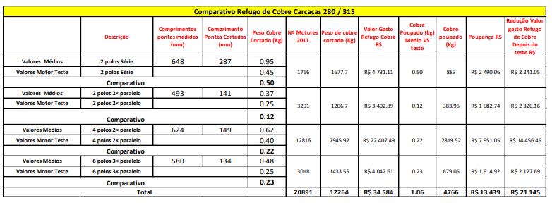 Sendo assim foi feito um estudo de refugo de cobre por tipo de motor tendo-se em conta a sua polaridade, a(s) bitola(s) dos fios das bobinas, o seu tipo de ligação, o número de cabos de ligação e a bitola dos cabos de ligação. Com este estudo dá para se ter uma ideia do refugo gerado da maior parte de familias de motores tendo-se em conta as amostras recolhidas.