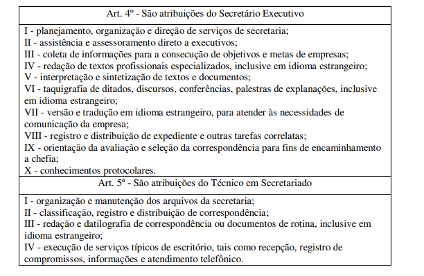 Assim, extraídos da Lei nº 7.377/85, seguem abaixo os artigos que estabelecem as principais atividades dos Secretários Executivos e dos Técnicos em Secretariado:
