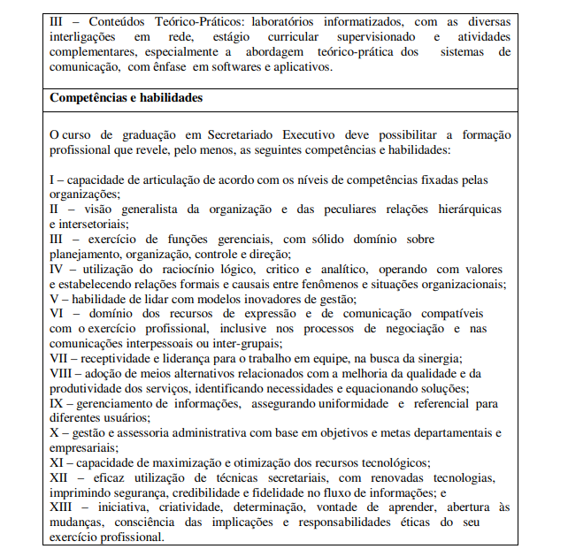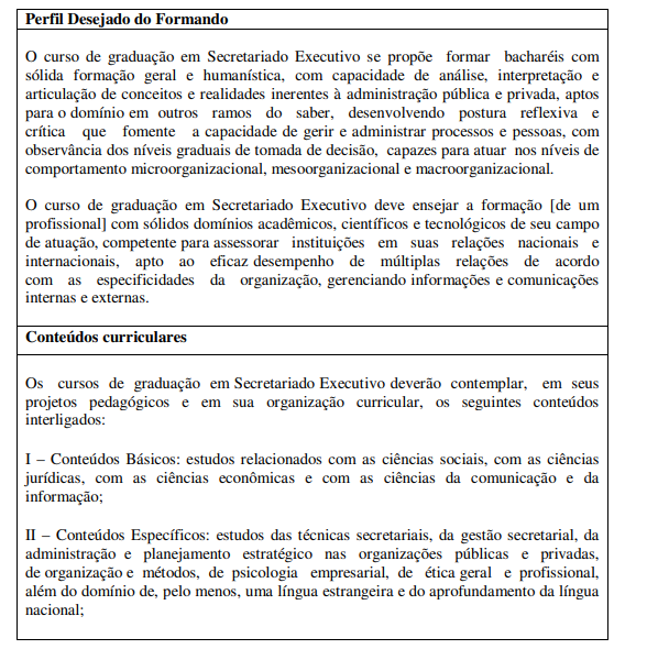Apenas em 2004, com o Parecer 102/04, da Câmara de Educação Superior (CES), foram estabelecidas as Diretrizes Curriculares Nacionais para o curso de Graduação em Secretariado Executivo30, que entre outras determinações incluem: