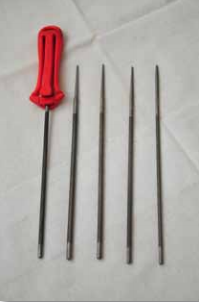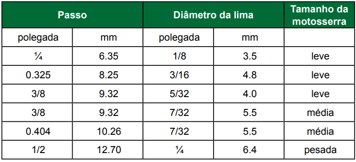 Lima redonda – utilizada para afiar o dente de corte, podendo ser encontrada nas medidas abaixo, devendo ser selecionadas de acordo com o “passo” da corrente.