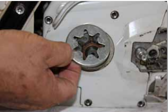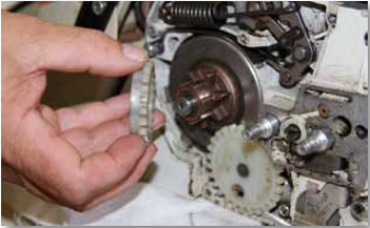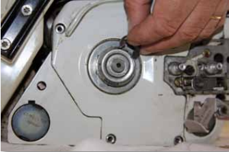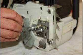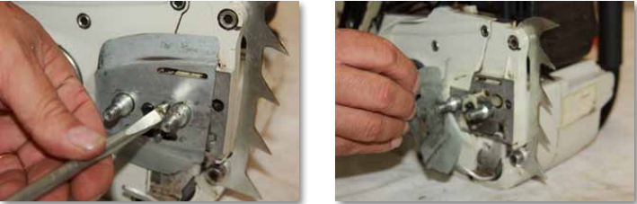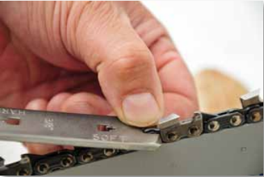 A guia no dente de corte tem a finalidade de limitar a profundidade do corte na madeira. A verificação é feita utilizando-se o calibrador, seguindo as recomendações do fabricante da corrente.