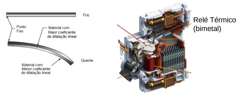 • Os relés térmicos tem como princípio de atuação a deformação de um bimetal. O bimetal é formado por duas lâminas de metais diferentes (normalmente ferro e níquel) cujo coeficiente de dilação é diferentes, e com o aumento da temperatura provocado pelo aumento da circulação de corrente pelo bimetal este se deforma.