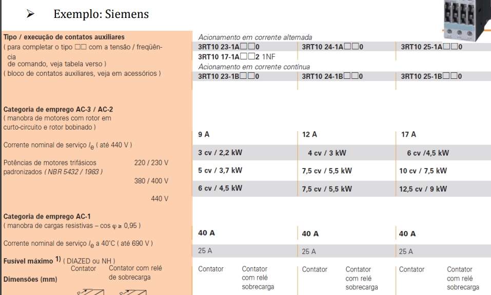 - 3º Critério de escolha do Fusível– devem proteger também os dispositivos de acionamento (contatores e relés térmicos) evitando assim a queima destes. Para isso verifica-se o valor máximo do fusível admissível na tabela dos contatores e relés.