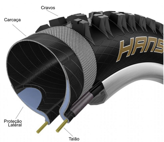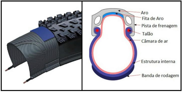 Um pneu de bicicleta é formado por diversos componentes permanentemente unidos durante o processo de fabricação. São eles: