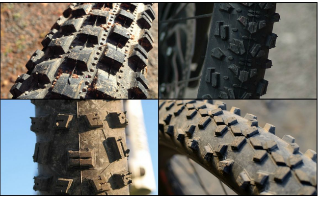 Desenho - Pode variar de cravos grandes até pneus lisos (slicks). Normalmente, os mais lisos são utilizados no asfalto. Nos pneus de MTB, o desenho e o formato dos cravos tem uma importante ligação com o uso que será feito do pneu. Em geral cravos mais juntos e baixos costumam ser mais rápidos na terra batida, enquanto os mais altos e separados costumam funcionar melhor na lama.