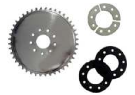 Depois de instalados os discos de borracha, a coroa, as meias luas e os parafusos aperte bem sempre verificando se a coroa se mantém centrada em relação ao eixo da roda.