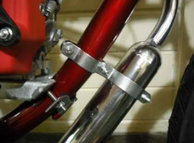 Instale então o suporte de escape que acompanha o kit. Ele pode ser do tipo cinta como mostra a imagem ao lado ou em duas peças como mostra esta outra imagem.