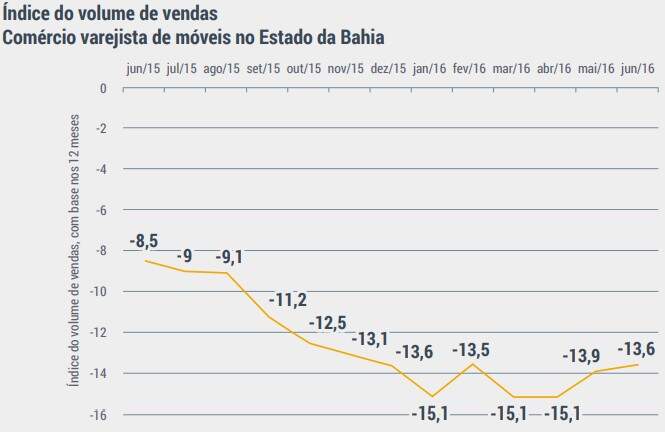 O comércio varejista de móveis, na Bahia, apresenta índice de volume de vendas negativo. Entretanto, isso não é uma particularidade desse estado. Devido à instabilidade econômica do país, outras UF apresentam situações semelhantes. O ponto positivo, porém, é que esses índices têm apresentado leve recuperação nos últimos meses, indicando que a perspectiva de futuro é otimista. É importante ressaltar, porém, que os móveis produzidos para ambientes residenciais podem facilmente ser adaptados para hotéis, pousadas, bares, escritórios, restaurantes e outros estabelecimentos comerciais. Como os móveis planejados são versáteis, a diferença desses ambientes está principalmente no projeto de arquitetos, designers e demais profissionais relacionados. O móvel, em si, pouco se diferencia.