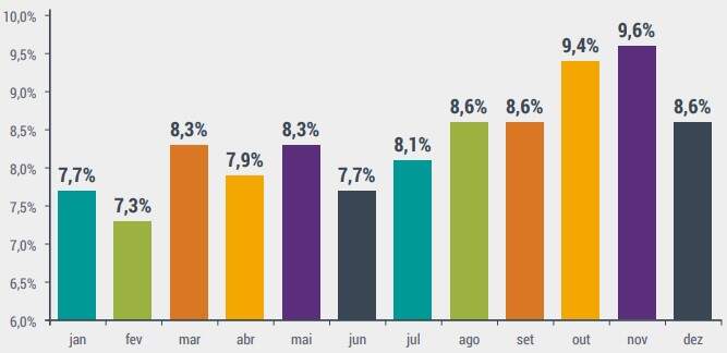 A produção de móveis no país apresenta característica sazonal, sendo os meses de outubro e novembro os que apresentam maiores volumes, o que se justifica pelo pagamento do 13º salário aos trabalhadores. A sazonalidade, avaliada entre os anos de 2002 a 2015, pode ser visualizada no gráfico abaixo:
