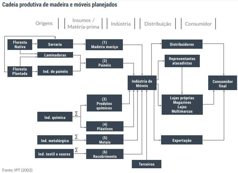 O encadeamento produtivo proporciona que os pequenos negócios atuem como fornecedores ou distribuidores de produtos para empresas de maior porte dentro da cadeia produtiva de um segmento. Ele pode ser observado na Cadeia Produtiva de madeira e de móveis planejados, que interage com diversas atividades de valor da economia.