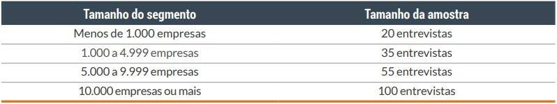 Considera-se suficiente, para exploração de informações de cunho qualitativo, a amostra de três entrevistas por segmento. Isso porque se trata da segunda fase da pesquisa (que já tem dados levantados) e de questionário exaustivo realizado com empresários que pertencem a um mesmo contexto. A intenção da pesquisa qualitativa é identificar tendências e percepções subjetivas a respeito do fenômeno investigado, dispensando grandes amostras e comprovação estatística.