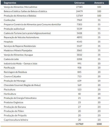 - . A partir de uma listagem contendo mais de 300 mil microempresas (ME), microempreendedores individuais (MEI) e empresas de pequeno porte (EPP) do Estado da Bahia, coletadas por meio da fonte Receita Federal, foram selecionadas empresas que correspondessem aos 27 segmentos de atuação pesquisados e que estivessem instaladas nos 27 municípios pesquisados. Esse filtro gerou um universo de pesquisa de 117.969 empresas;