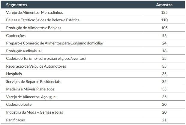 Para cada um dos 27 segmentos pesquisados, foi alocada uma amostra de, pelo menos, 20 casos - conforme a disponibilidade de casos verificada no universo de empresas de cada segmento. A amostra de pelo menos 20 casos por segmento é suficiente para fornecer uma análise exploratória destes, bem como uma comparação exploratória entre os diferentes segmentos.