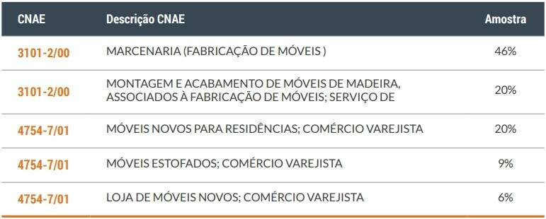 As empresas do segmento de madeira e móveis planejados se dividem em indústria, comércio e serviços. A seguir, a divisão por CNAE das empresas pesquisadas.