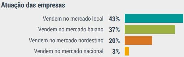 A principal atuação das empresas pesquisadas é no mercado local, isto é, na cidade em que estão inseridas. As empresas também atuam no mercado baiano e em outros estados do Nordeste, sendo que apenas 3% delas vendem seus produtos para outros estados do país.