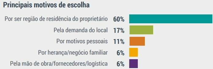 O principal motivo de escolha do local do estabelecimento foi o proprietário já residir naquela região. Porém, 23% dos empresários afirmaram ter escolhido o local em função da demanda do local ou de fatores propícios para o negócio, como disponibilidade de mão de obra, de fornecedores e boa logística disponível.