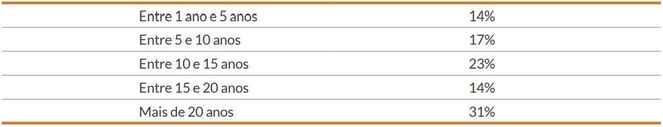 O tempo de mercado varia consideravelmente entre as empresas pesquisadas. Contanto, 45% delas estão abertas há mais de 15 anos, demonstrando boa tradição no mercado em que atuam.