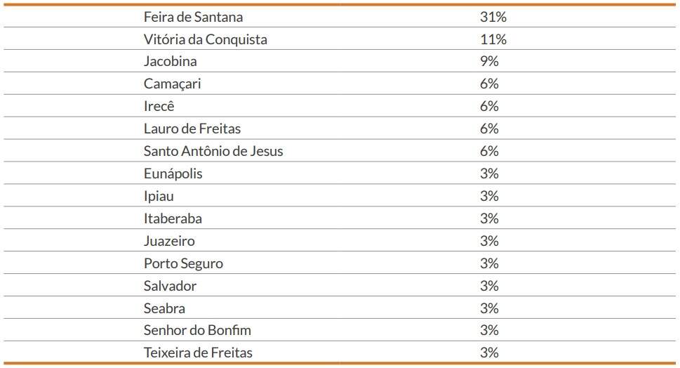 Abrangência: foi estabelecido como critério entrevistar responsáveis por pequenos negócios localizados em municípios em que há sede do Sebrae. Dessa forma, são considerados na pesquisa 27 municípios, incluindo a capital. São eles: Alagoinhas, Barreiras, Brumado, Camaçari, Euclides da Cunha, Eunápolis, Feira de Santana, Guanambi, Ilhéus, Ipiaú, Irecê, Itaberaba, Itabuna, Itapetinga, Jacobina, Jequié, Juazeiro, Lauro de Freitas, Paulo Afonso, Porto Seguro, Salvador, Santo Antônio de Jesus, Seabra, Senhor do Bonfim, Teixeira de Freitas, Valença e Vitória da Conquista.