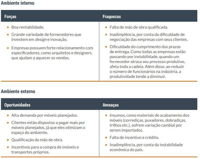 A seguir, será apresentado o diagnóstico do segmento, que consiste na análise do ambiente interno (forças e fraquezas) e do ambiente externo (oportunidades e ameaças relacionadas ao segmento). Os itens internos são de responsabilidade e controle dos empresários. Já os aspectos externos não podem ser controlados pelo empreendedor. Essa análise facilita a visão do todo. Os empresários podem avaliar suas condições atuais e estabelecer estratégias para atuar no mercado em diversas situações.