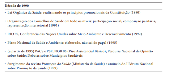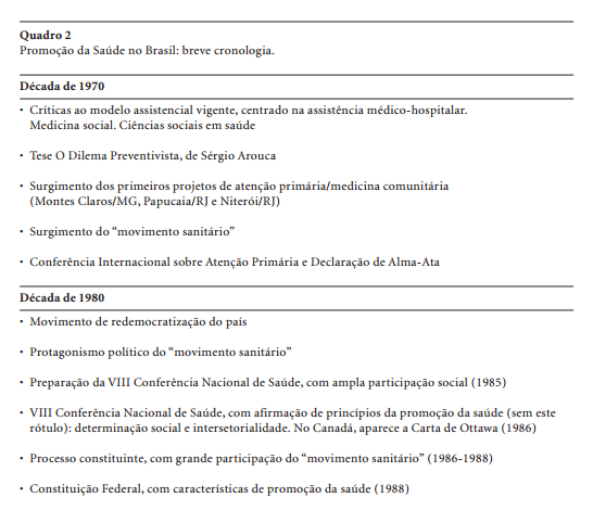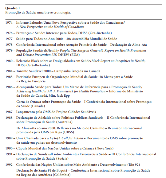 Na realidade, o conceito de promoção da saúde vem sendo elaborado por diferentes atores técnicos e sociais, em diferentes conjunturas e formações sociais, ao longo dos últimos 25 anos. Inúmeros eventos internacionais, publicações de caráter conceitual e resultados de pesquisa têm contribuído para aproximações a conceitos e práticas mais precisas para este campo. Nos Quadros 1 e 2 encontra-se uma breve (e certamente incompleta) cronologia do desenvolvimento do campo da promoção da saúde no mundo e no Brasil, conforme Buss (1998).