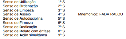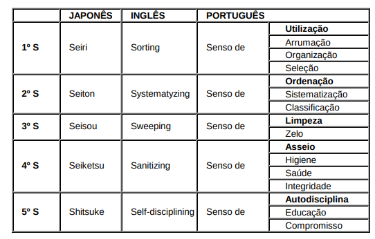 Como você deve ter percebido, cada "S" é conhecido por diversas denominações. Porém, neste texto, utilizaremos a terminologia de cada "S" da seguinte maneira: