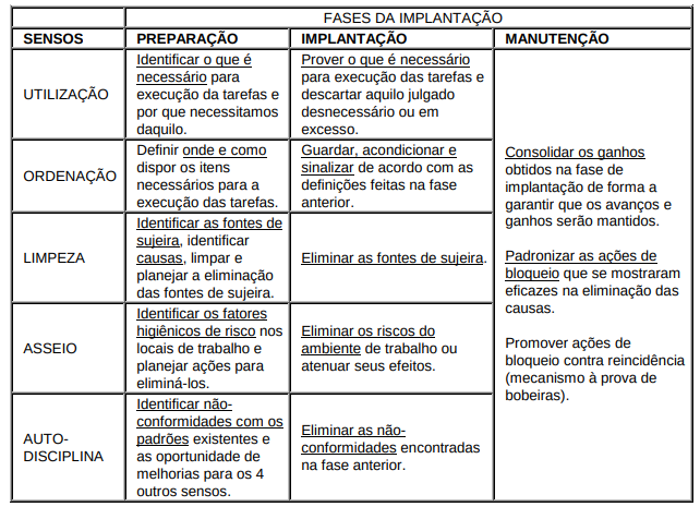 Entretanto, é difícil consolidar a adoção de padrões operacionais em ambientes e situação de desordem relativa a equipamentos, peças, materiais, ferramentas etc. Da mesma forma, a existência de objetos estranhos, poeira, lama, lixo, aparas e outros nos locais de trabalho, podem não somente influenciar negativamente na saúde e integridade dos executantes como também causar danos, defeitos e falhas em equipamentos. O resultado disto são quebras inesperadas de equipamentos, ferramentas não disponíveis, deterioração de peças e materiais etc.