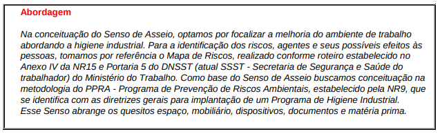 Ter Senso de Asseio significa criar condições favoráveis à saúde física e mental, garantir ambiente não agressivo e livre de agentes poluentes, manter boas condições sanitárias nas áreas comuns (lavatórios, banheiros, cozinha, restaurante etc.), zelar pela higiene pessoal e cuidar para que as informações e comunicados sejam claros, de fácil leitura e compreensão.