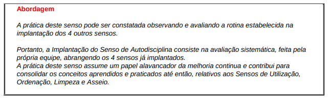 Deste modo, o sucesso na adoção de padrões operacionais pode ser obtido somente após estabelecido os padrões ambientais de Utilização, Ordenação e Limpeza, bem como o desenvolvimento do Senso de Asseio e educação para execução dos padrões, disciplinadamente. Em outras palavras, a adoção dos conceitos de 5 S constitui um passo importante e fundamental no desenvolvimento de atitudes positivas na condução da padronização de tarefas.