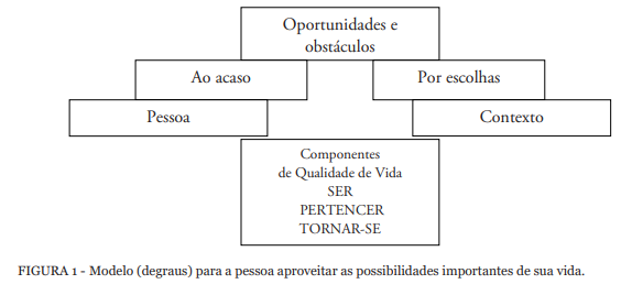 Diferentes aspectos que definem a qualidade de vida são apresentados na literatura, como, por exemplo, poder aproveitar as possibilidades da vida, de escolher, de decidir e ter controle de sua vida (RENWICK & BROWN, 1996). Cita-se como exemplo o modelo ilustrado na FIGURA 1: