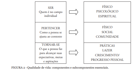 Considerando o modelo apresentado, o “ser” é entendido como o que o ser humano é, resultado de sua nutrição, aptidão física, habilidades individuais, inteligência, valores, experiências de vida, etc. Quanto ao “pertencer” trata-se das ligações que a pessoa tem em seu meio, casa, trabalho, comunidade, possibilidade de escolha pessoal de privacidade, assim como da participação de grupos, inclusão em programas recreativos, serviços sociais, etc. O “tornar-se” remete à prática de atividades como trabalho voluntário, programas educacionais, participação em atividades relaxantes, oportunidade de desenvolvimento das habilidades em estudos formais e não formais, dentre outros. Esses componentes apresentam uma organização dinâmica entre si, consideram tanto a pessoa, como o ambiente, assim como as oportunidades e os obstáculos como ilustrado na FIGURA 2.