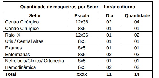 Os maqueiros do turno diurno do quadro abaixo ficam distribuídos pelos setores de maior incidência de movimentação e transportes de pacientes determinados pelo tipo de unidades de saúde e emergências médicas, Desta forma podem atender a necessidade de demanda dos pacientes com rapidez e eficiência, questões preponderantes no atendimento hospitalar. Já os maqueiros da noite ficam localizados principalmente no Pronto Socorro e nos setores de Ortopedia e Raio X. Os funcionários do setor de Enfermagem do Hospital trabalham no regime de 12 horas/36 horas, dias alternados, com carga horária diária de 12 horas, com folga de 5 por 1(trabalha um dia 12 horas, folga no outro, após cinco dias, tem duas folgas).