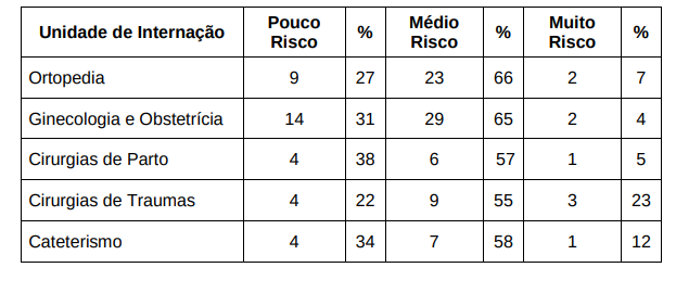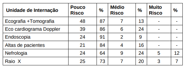 São exemplos de unidades com pouco risco ergonômico diversos setores de atendimento, como Exames de Raio X, Tomografia, Ecocardiograma Doppler, Endoscopia, Altas de pacientes entre outros. Pode-se perceber que diversas situações de atendimento no Pronto Socorro apresentam a maioria de seus pacientes com pouco risco ergonômico, conforme o quadro a seguir "Classificação dos riscos ergonômicos em unidades de internação que apresentaram maior parcela de pacientes na faixa de pouco risco ergonômico. Região Metropolitana de Curitiba. 2014".