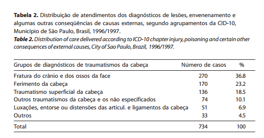 Desses atendimentos podem-se notar a distribuição de casos para Fratura do crânio e dos ossos da face (36,8%), Ferimento da cabeça (23,2%), Traumatismo superficial da cabeça (18,5%) e demais casos segundo a CID-10 descritos na Tabela 2.
