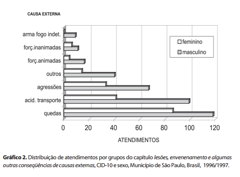 Quanto ao sexo, essas lesões se distribuem 65,8% para o sexo masculino, confirmando o coeficiente de atendimento bastante diferenciado para os dois sexos (2,0 e 1,0 por mil atendimentos, masculino e feminino, respectivamente), o que confirma os estudos de Travassos e Lebrão e Mello Jorge.