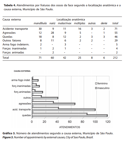 Todas as lesões ocorridas por arma de fogo aparecem para o sexo masculino e causam fraturas em 55,5% dos casos. O envolvimento do sexo masculino nas lesões por causa externa se evidencia até nos acidentes esportivos, 86,7% dos casos atendidos eram homens e, destes, 76,9% sofreram fraturas na face.