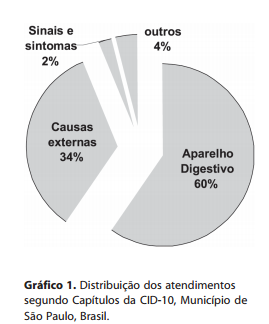 A distribuição dos atendimentos segundo os capítulos da CID-10 mostrou uma concentração de 1.269 casos (60%) para o capítulo Doenças do Aparelho Digestivo, seguido por Lesões, envenenamento e algumas outras conseqüências de causas externas, com 734 casos (34%), restando 2% para Sintomas, sinais e achados anormais de exames clínicos e de laboratório não classificados em outra parte e 4% para os demais capítulos (Gráfico 1).