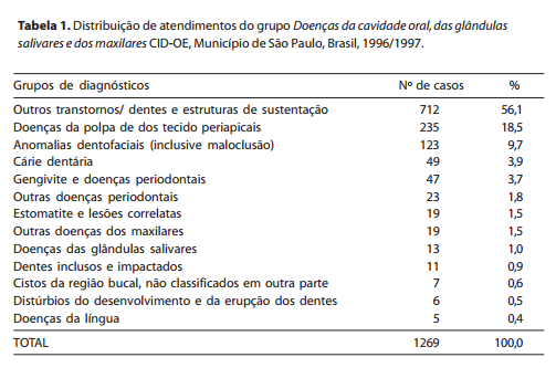 Entre os casos classificados no capítulo Doenças do Aparelho Digestivo, todos os diagnósticos pertencem ao grupo Doenças da cavidade oral, das glândulas salivares e dos maxilares (Tabela 1). Dentro desse grupo destacam-se, Outros transtornos dos dentes e estruturas de sustentação (56,1% dos casos), onde se encontram os casos de dores de dente e restos de raízes dentárias, Doenças da polpa e dos tecidos periapicais (18,5% dos casos). Outros autores notam uma diminuição desses casos, em outros países, com um aumento dos casos originados nas causas externas. O sexo feminino apresentou um pouco mais de casos que o masculino, ficando em torno de 56,9% dos atendimentos; isso se confirma em outros achados que estudaram demanda por serviços e faz supor que acompanhe a própria distribuição da população por sexo (SEADE, 1996). Em Anomalias dentofaciais encontram-se os diagnósticos ligados a disfunções da articulação temporomandibular (ATM), com destaque para a relação de gênero que nesse grupo demonstrou que 72,3% dos casos são do sexo feminino, confirmando padrão semelhante ao observado nesta cidade em 1993 e na literatura básica de odontologia.