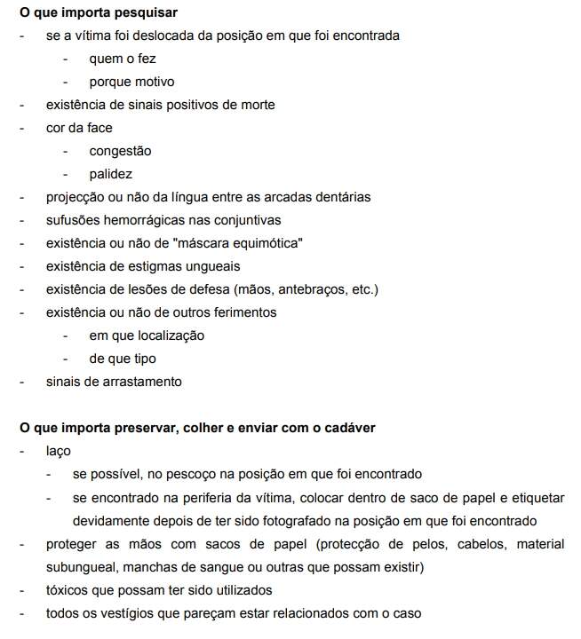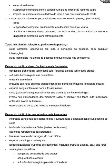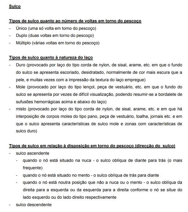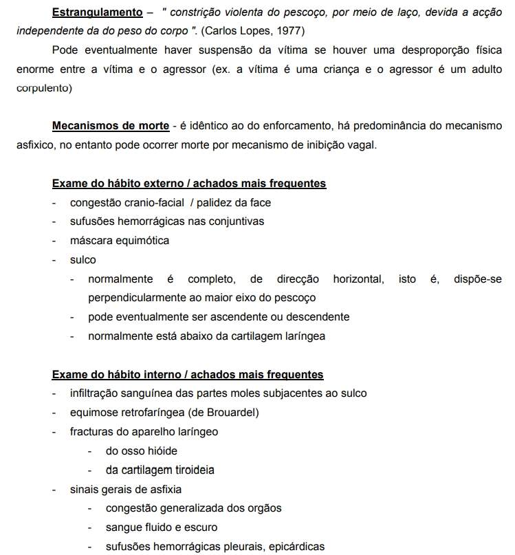 - Enforcamento – quase sempre corresponde a uma situação de suicídio / poderá ter um carácter acidental (enforcamento sexual) ou mesmo homicida.