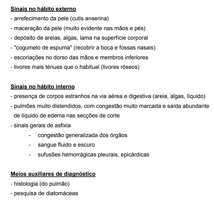 Submersão: "é a morte que resulta da supressão do arejamento pulmonar por obstáculo constituído por líquido que penetra nas vias aéreas (submersão-asfixia), ou a que resulta do simples contacto do líquido com o corpo (submersão-inibição)" (Carlos Lopes, 1977).