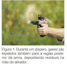 Na utilização de armas de fogo em episódios de crime, são produzidos vestígios de disparo, os quais são expelidos pela expansão gasosa oriunda da combustão da carga explosiva presente nos cartuchos que compõem a munição dessas armas. Tal expansão gasosa dá-se preferencialmente através da região anterior do cano da arma, orientada para a frente; porém, uma parcela desse fluxo de massa gasosa é também expelida pela região posterior da arma, em decorrência da presença de orifícios da culatra (para revólveres) ou do extrator (no caso de pistolas), conforme visualizado na Figura 1. al fluxo gasoso carrega em sua composição os gases oriundos da combustão (CO2 e SO2 ), bem como uma ampla gama de compostos inorgânicos, tais como nitrito, nitrato, cátions de metais como chumbo e antimônio e particulados metálicos oriundos do atrito e da subseqüente fragmentação dos projéteis metálicos disparados. Quando o fluxo gasoso emitido pela região traseira da arma atinge a superfície da mão do atirador, tais partículas sólidas aderem à superfície da pele. Um teste comumente utilizado para a detecção de vestígios de disparo de arma de fogo nas mãos de um possível suspeito consiste na pesquisa de íons ou fragmentos metálicos de chumbo, em decorrência da maior quantidade desta espécie metálica em relação a outras.