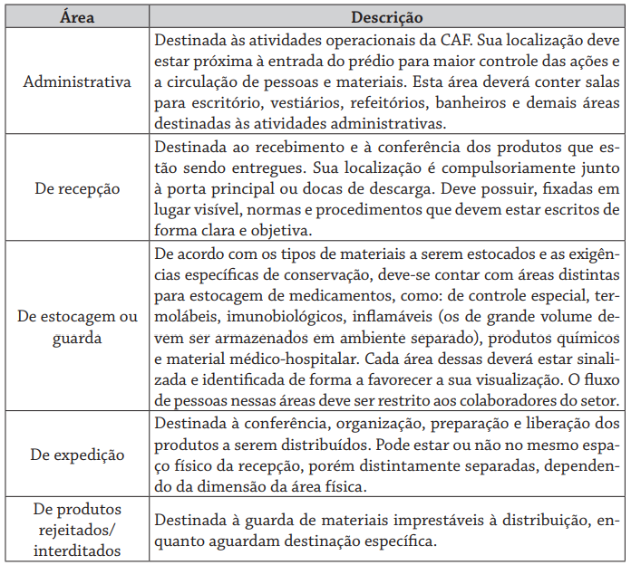 Considerando as atividades relacionadas ao armazenamento de medicamentos, a CAF deverá se constituir de áreas que contemplem as necessidades do serviço, levando em conta o volume e os tipos de produtos a serem estocados, conforme destacado no Quadro 1.