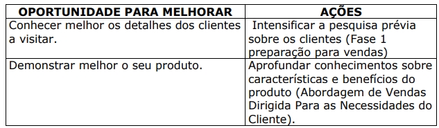 Esta seção o ajudará a aplicar as idéias desenvolvidas durante o curso, permitindo registrar informações e idéias de ações nas diferentes fases do processo das vendas, e lhe dará a oportunidade de usar estes dados na montagem de uma apresentação de vendas profissional dos seus produtos. Toda as vezes, após seu trabalho, efetue uma análise, indiquem abaixo na coluna da esquerda quais os pontos você deve examinar mais atentamente para melhorar o desempenho. Na direita, a note as ações que permitirão implementar melhorias através das oportunidades identificadas. Por exemplo: