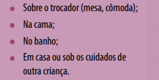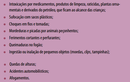 Para evitar as quedas de brinquedo de velocidade (bicicleta, velocí- pede), compre os materiais de segurança recomendados (capacetes, joelheiras, cotoveleiras) e só permita a sua utilização em locais protegidos (nunca na rua). Para evitar afogamentos, não nadar em locais desconhecidos, longe da margem e orientar a não mergulhar de cabeça na água. Para andar sozinho na rua, a pé ou de bicicleta, a criança deve estar efetivamente treinada, conhecer e obedecer às regras de trânsito, para evitar que se envolva em acidentes.