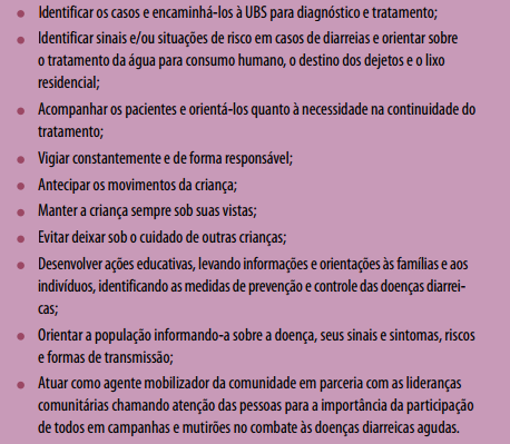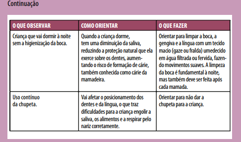 Os bons hábitos alimentares e de higiene bucal na família irão interferir no comportamento das crianças. Por essa razão, o ACS deve orientar a família nos cuidados da higiene bucal e ainda na mudança de alguns hábitos alimentares, como a redução do uso do açúcar no leite, em sucos ou chás.