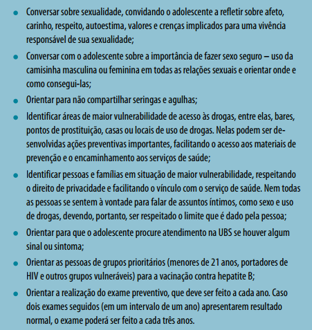 Utilizando uma linguagem acessível, simples e objetiva, devem ser dadas informações completas e precisas sobre sexualidade, contracepção, gravidez, proteção contra doenças sexualmente transmissíveis e realização do preventivo de câncer do colo uterino. O início da atividade sexual, cedo/precoce ou tardia, deve ser precedido das informações necessárias para uma vida sexual saudável, livre de doenças e de problemas.