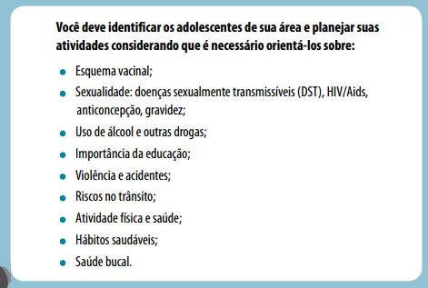 Conforme já abordado, seu trabalho requer uma relação de vínculo e confiança. Para trabalhar com adolescentes, essa relação é fundamental. Entender a fase pela qual estão passando, estar disponível para ouvi-los, dentro da sua realidade, respeitar a diversidade de ideias, sem julgar. A promoção à saúde e prevenção de agravos para o adolescente deve ser desenvolvida pela equipe em integração com diferentes instituições na comunidade, como a escola, ação social, cultura, grupos de jovens, de arte, capoeira, hip hop, entre outros. Deve-se aproveitar para divulgar informações, ajudando no esclarecimento de dúvidas e na sensibilização da comunidade.