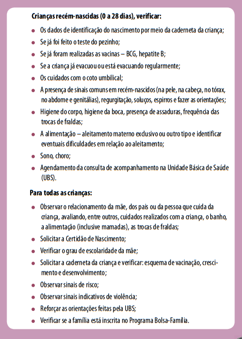 Atenção: você deve informar imediatamente a equipe de saúde se na visita domiciliar encontrar a criança com alguma situação acima descrita. Deve ainda reforçar com a mãe, o pai ou quem cuida da criança as orientações dadas pela UBS.,